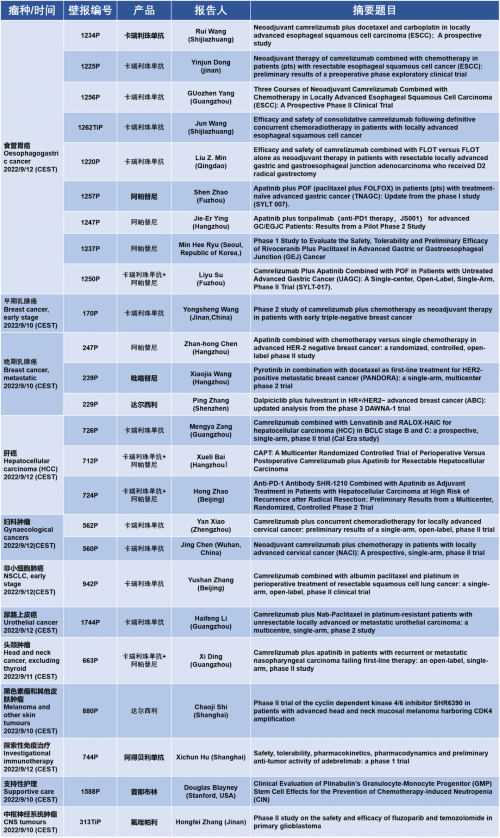 作为从事创新和高品质药物研发的国际化制药企业,恒峰g22医药的研究成果在2022 ESMO大会上还收获了25项壁报形式的报告。其中,食管胃癌领域共有9项研究入选,研究的方案主要是卡瑞利珠单抗或卡瑞利珠单抗联合阿帕替尼,通过与化疗或放化疗联用,新辅助治疗食管鳞癌或胃癌。2022年9月12日(CEST),让我们齐聚ESMO大会,共同领略食管胃癌研究领域的学术盛宴。此外,恒峰g22医药达尔西利、吡咯替尼、阿得贝利单抗等创新药还有4项乳腺癌研究、3项肝癌研究及其他领域的9项研究都将会以壁报展出,让我们共同期待!