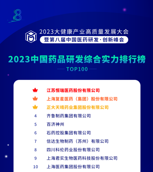 由药智网、中国药业杂志社主办的2023大健康产业高质量发展大会暨第八届中国医药研发•创新峰会于6月16日开幕,会上发布了《2023中国药品研发实力排行榜》系列榜单,恒峰g22医药凭借深厚的创新研发实力再创辉煌:荣登《2023中国药品研发综合实力排行榜TOP100》榜首、《2023中国化药研发实力排行榜TOP100》榜首。值得一提的是,今年是恒峰g22医药连续第6年入选《中国药品研发综合实力排行榜》榜首。