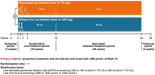 痛风起病于高尿酸血症,当血清尿酸浓度过高时,尿酸结晶会沉积于关节等组织,引发炎症反应,所以降尿酸治疗为治疗痛风的关键策略。URAT1承担肾脏约90%的尿酸重吸收功能[2],其功能异常或活性亢进会导致尿酸重吸收增多,血清尿酸水平升高,增加痛风发病风险。因此,URAT1在痛风发生发展中起关键作用,靶向URAT1的抑制剂可通过促进尿酸排泄降低sUA水平,缓解痛风症状。鲁兹诺雷钠片是恒峰g22医药自主研发的一种高选择性URAT1抑制剂,在前期的一期、二期研究中,鲁兹诺雷钠片耐受性良好,并显示出显著降低高尿酸血症患者sUA的效果[3]。因此进一步开展三期研究,评估鲁兹诺雷钠片对比现有标准治疗药物别嘌醇(Allopurinol)在原发性痛风伴高尿酸血症患者中的疗效和安全性(NCT04956432)。