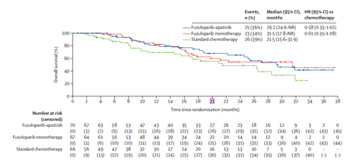 与医生选择标准化疗相比,氟唑帕利单药治疗的OS同样展示出良好的获益趋势,中位OS分别为31.5个月vs.21.5个月,HR为0.61,氟唑帕利单药治疗降低了39%的死亡风险。